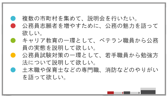 - キャリア教育の一環として、ベテラン職員から公務員の実態を説明して欲しい。